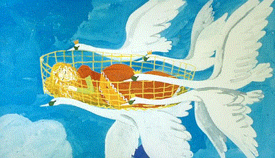 szárazföld felé. Fejükön csepp aranykorona tündöklött, olyan volt a csapat, mint egy égre lebbenő, könnyű, fehér fátyol. A királylány fölment