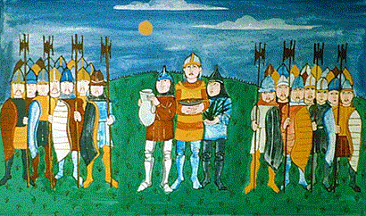 - Árpád paripáját bunkósbottal verjétek agyon! Az aranyos féket rekkentsétek a fűbe. A cifra nyerget dobjátok a Dunába, hadd sodorja el a víz árja! Vidd hírül uradnak, követ! Az én földem messze elkerüljétek, mert ha idemerészkedtek, kardomat összetöröm a hátatokon.